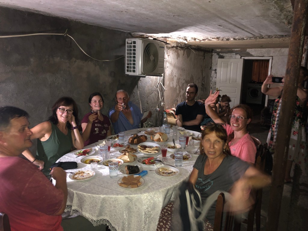 Odjíždíme z Bohumína kolem 12 hodiny směr Krakow odkud nám kolem 17 hodiny odlétá letadlo směr Kutaisi. Letěli jsme klasicky WizzAirem. Díky chaosu jsme dobíhali ke gatu zase mezi posledními, zdrželi jsme se dlouho na celní kontrole. Po příletu do Kutaisi na nás čekal Enveri, náš Gruzínský přítel. Jeli jsme k němu domů, kde pro nás bylo připraveno typické gruzínské pohoštění s mnoha chody, hodně domácí Cha-Cha pálenky (opravdu hodně 😀 ) a domácího vína z vlastního vinohradu.