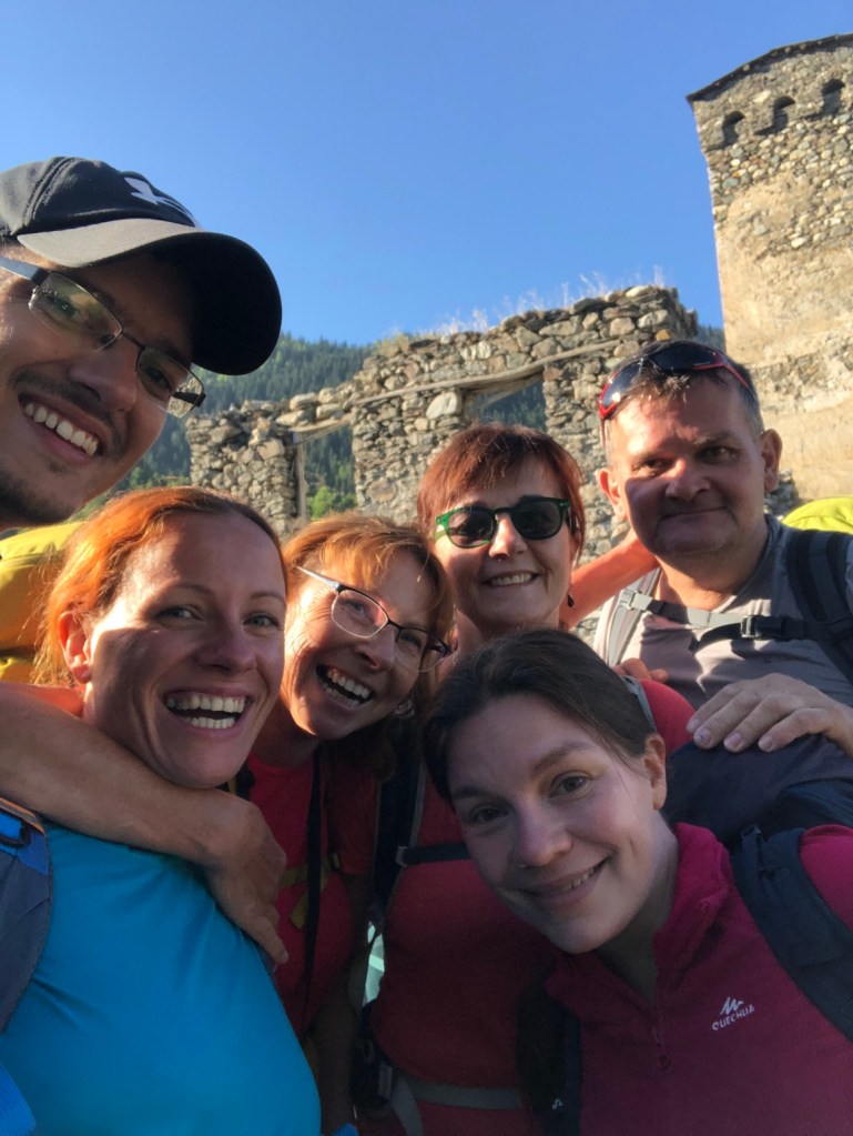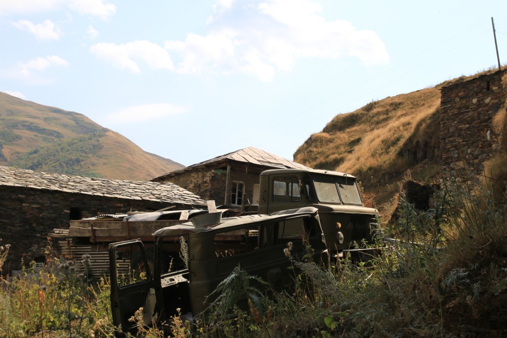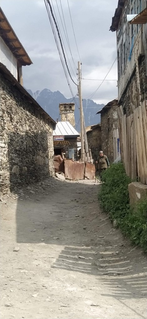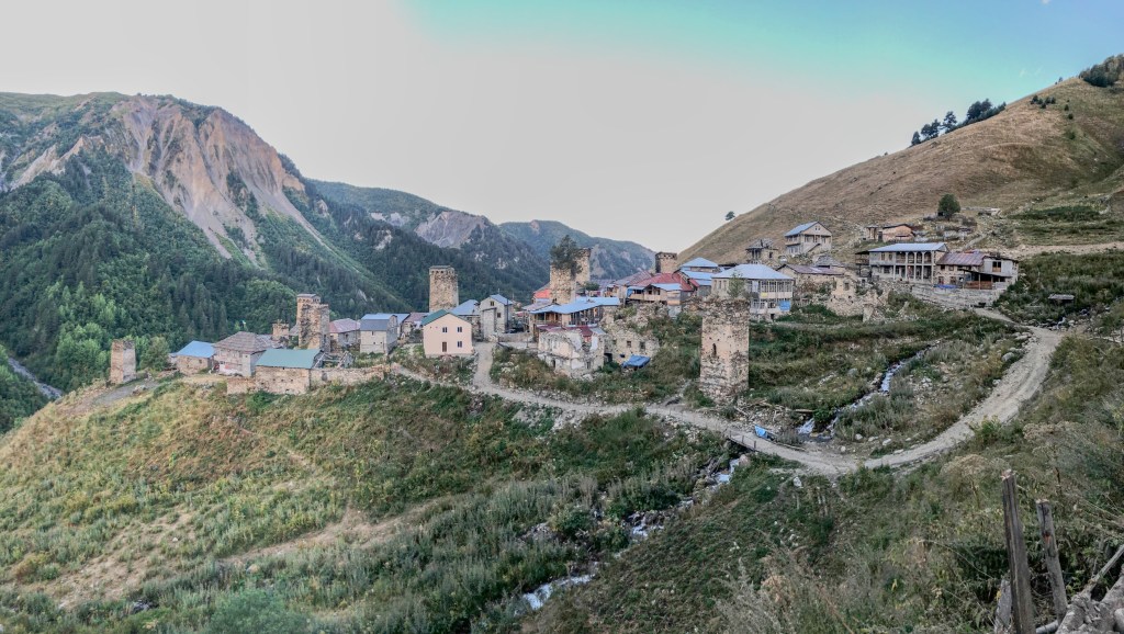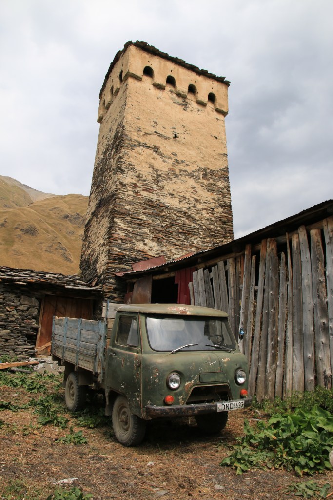 Ushguli je, jak sami Gruzínci rádi říkají, nejvýše trvale obydlená vesnice v Evropě. Prameny o tom jestli Gruzie patří do Evropy nebo už Asie, se liší. Každopádně ať už patří Ushguli kamkoliv, nachází ve výšce 2150 metrů nad mořem, tedy asi o 550 m výše než je vrchol Sněžky. Zimy jsou zde tuhé a vesnici víceméně odloučí od zbytku světa. Vesnice je zapsaná v seznamu světového kulturního dědictví UNESCO. Je zde zachovaný velký počet Svanetských věží, které byly pro místní obyvatele bezpečnou pevností proti nájezdům Mongolů, Peršanů i Osmanů. Vevnitř měli vše co potřebovali na dlouhé měsíce, pokud byli v obležení. Nakonec přišla zima, která nájezdníky vyhnala. Svanetské věže byly postaveny v 9.-12. století a stojí dodnes. My jsme v Ushguli již byli před čtyřmi lety, ale jen na pár hodin. V místním “muzeu” jsme navštívili paní, která nás před čtyrmi lety pozvala na čaj. Její manžel bych horský vůdce a záchranář, který byl i na výcviku horské služby v Krkonoších. Dovezli jsme ji fotografie z minulé návštěvy. Zároveň jsme koupili svanetskou sůl. Perfektní směs soli a koření, která je vyhlášená. Koupíte ji víceméně v celé Gruzii, ale tady tahle paní ji má zdaleka nejlepší. Pomalu jsme se přesunuli ke kostelíku nad vesnicí, kde jsme měli možnost vidět začátek Svanetské svatby. Nevěsta v krásných šatech, ženich v místním typickém kroji přijel na koni – tady je to jiný svět. Od kostelíku je výhled na Shkharu – nejvyšší horu Gruzie a třetí nejvyšší horou Kavkazu s výškou 5193 m, která je od vás necelých 10 kilometrů. Na odpolední část dne Zuzka dostala nápad, že by se šla vykoupat. Koupaliště tady není, jezero taky ne, jediná možnost je ledovcová řeka Enguri vytékající z pod ledovce Shkhary. Nakonec jsme za vesnicí našli místečko a Zuzka a později i Renáta se odvážně vrhly až po krk do ledové vody – tipnete kolik stupňů má voda? Odpověď najdete v popiscích u fotek. Na kopečku v centru Ushguli stojí jediná věž, která je černá. Jde o věž patřící královně Tamar, která vládla v Gruzii v letech 1184 až 1213.