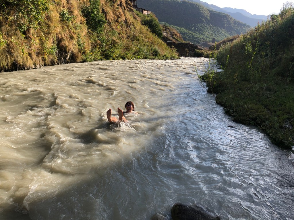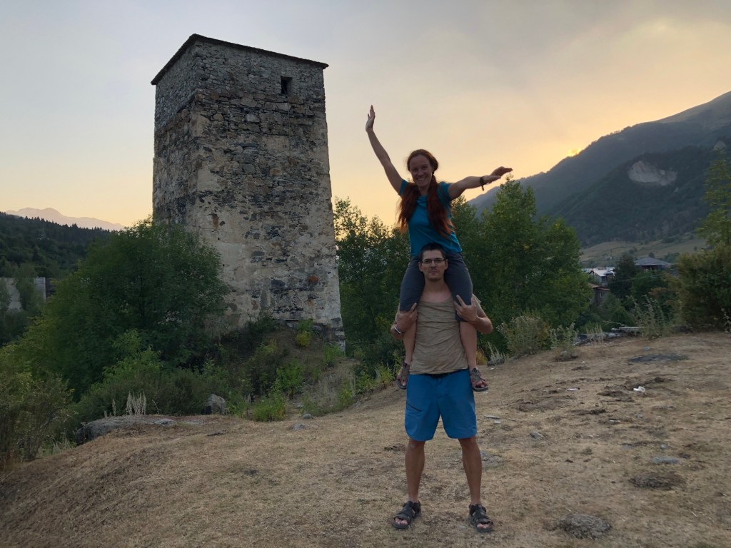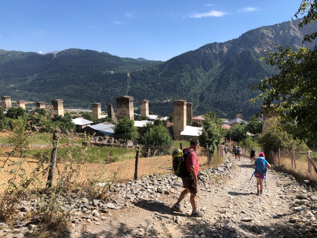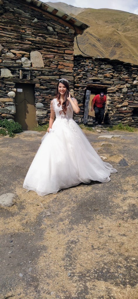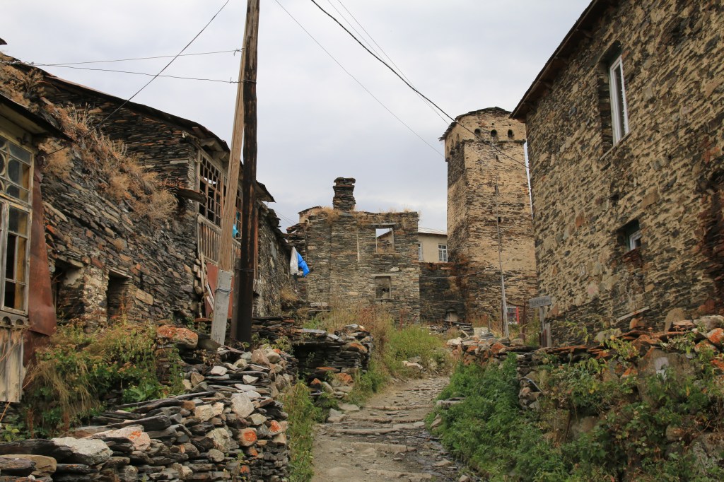Ushguli je, jak sami Gruzínci rádi říkají, nejvýše trvale obydlená vesnice v Evropě. Prameny o tom jestli Gruzie patří do Evropy nebo už Asie, se liší. Každopádně ať už patří Ushguli kamkoliv, nachází ve výšce 2150 metrů nad mořem, tedy asi o 550 m výše než je vrchol Sněžky. Zimy jsou zde tuhé a vesnici víceméně odloučí od zbytku světa. Vesnice je zapsaná v seznamu světového kulturního dědictví UNESCO. Je zde zachovaný velký počet Svanetských věží, které byly pro místní obyvatele bezpečnou pevností proti nájezdům Mongolů, Peršanů i Osmanů. Vevnitř měli vše co potřebovali na dlouhé měsíce, pokud byli v obležení. Nakonec přišla zima, která nájezdníky vyhnala. Svanetské věže byly postaveny v 9.-12. století a stojí dodnes. My jsme v Ushguli již byli před čtyřmi lety, ale jen na pár hodin. V místním “muzeu” jsme navštívili paní, která nás před čtyrmi lety pozvala na čaj. Její manžel bych horský vůdce a záchranář, který byl i na výcviku horské služby v Krkonoších. Dovezli jsme ji fotografie z minulé návštěvy. Zároveň jsme koupili svanetskou sůl. Perfektní směs soli a koření, která je vyhlášená. Koupíte ji víceméně v celé Gruzii, ale tady tahle paní ji má zdaleka nejlepší. Pomalu jsme se přesunuli ke kostelíku nad vesnicí, kde jsme měli možnost vidět začátek Svanetské svatby. Nevěsta v krásných šatech, ženich v místním typickém kroji přijel na koni – tady je to jiný svět. Od kostelíku je výhled na Shkharu – nejvyšší horu Gruzie a třetí nejvyšší horou Kavkazu s výškou 5193 m, která je od vás necelých 10 kilometrů. Na odpolední část dne Zuzka dostala nápad, že by se šla vykoupat. Koupaliště tady není, jezero taky ne, jediná možnost je ledovcová řeka Enguri vytékající z pod ledovce Shkhary. Nakonec jsme za vesnicí našli místečko a Zuzka a později i Renáta se odvážně vrhly až po krk do ledové vody – tipnete kolik stupňů má voda? Odpověď najdete v popiscích u fotek. Na kopečku v centru Ushguli stojí jediná věž, která je černá. Jde o věž patřící královně Tamar, která vládla v Gruzii v letech 1184 až 1213.