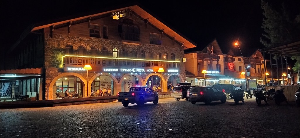 Druhý den jsme cestovali do Mestie. Co vám budu říkat, po prvním únavném dni cestování a půl litru Cha-Chi mi nedělaly Gruzínské uskákané silnice vůbec dobře 😀 Do toho bylo velké horko, kolem 35 stupňů a auto bez klimatizace. Projíždíme známou trasu do Mestie, která vede přes Zugdidi a po hranici samozvané republiky Abcházie – Ruskem okupovaného území Gruzie. Míjíme poloprázdnou přehradní nádrž Enguri. Mimochodem tato přehradní nádrž má druhou nejvyšší betonovou hráz světa o výšce 271 metrů. Instalované turbíny na výrobu elektřiny mají výkon jako polovina našeho Temelína. Zastavujeme na vyhlídce nad přehradou. Tady nastává první problém. Náš postarší Mercedes nejde nastartovat. Ale řešení na sebe nenechá dlouho čekat. Projíždějící řidič stejného vozu tento problém evidentně neviděl poprvé. Jeho ruka se šroubovákem mizí pohotově až po rameno do útrob motoru, kde zkratuje startér a motor ihned naskočí. Následovalo asi 10 vteřinové školení pro našeho řidiče a hned pokračujeme dále. Cesta v tom únavném vedru vůbec neutíká, ale odpoledne přijíždíme do Mestie, což je Gruzínská obdoba našeho Špindlu nebo polského Zakopaného. Ten den už jsme si stihli ulovit naší první Gruzínskou cacheku a zajít na večeři.