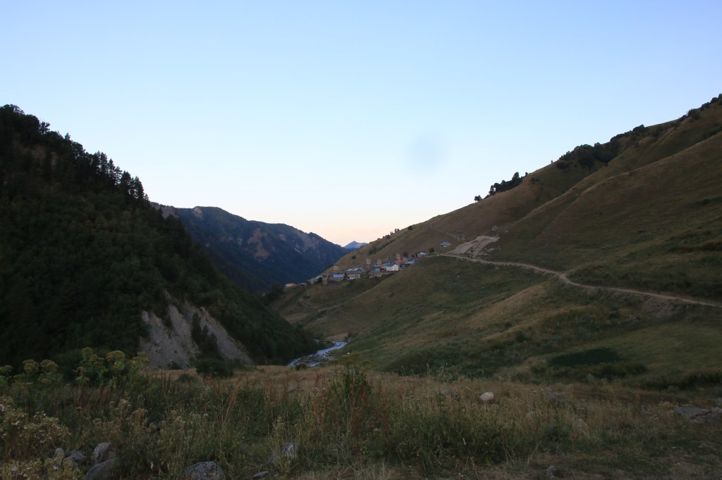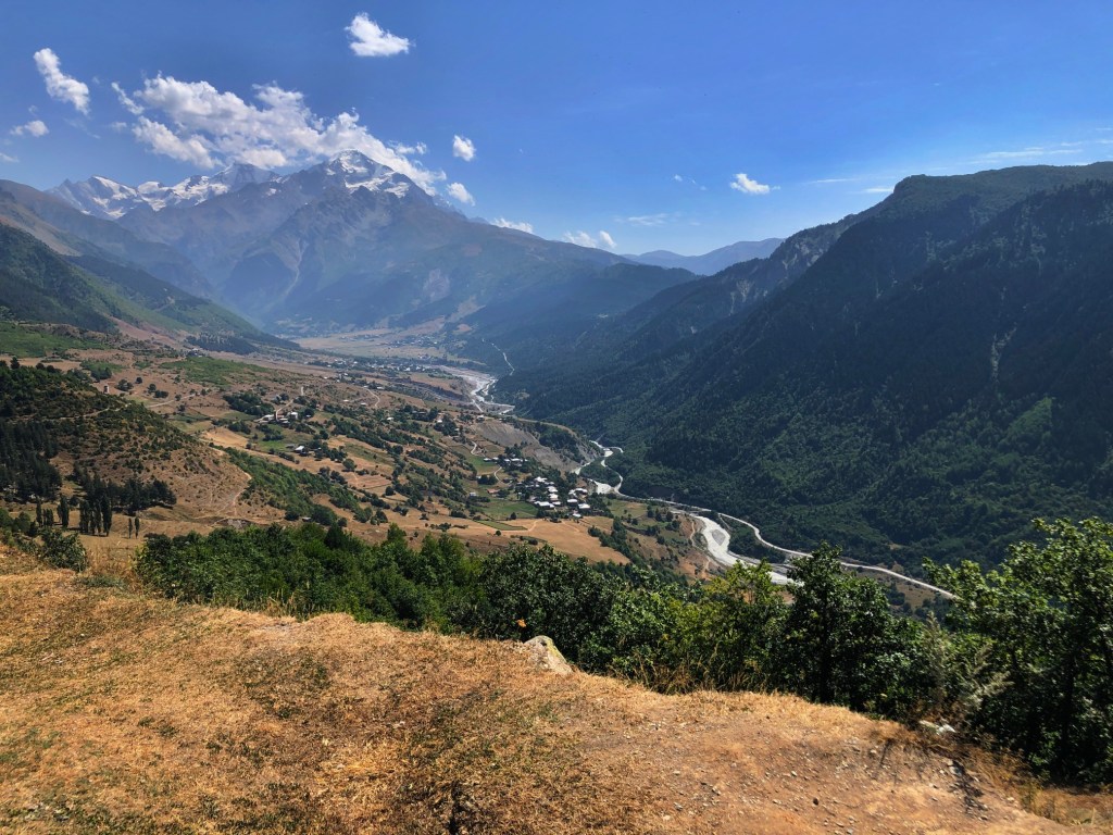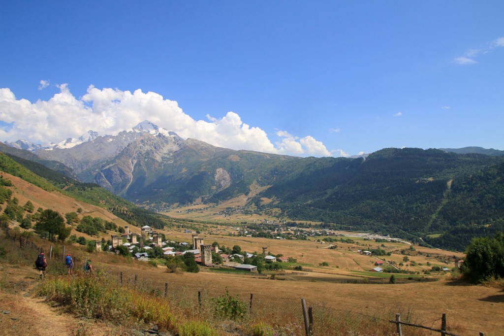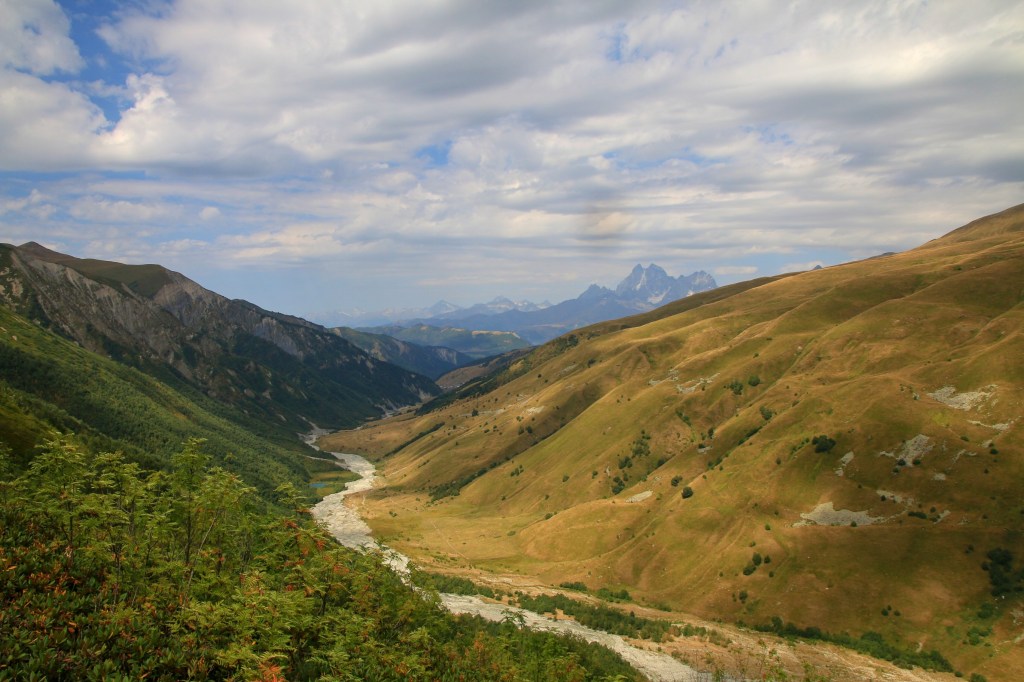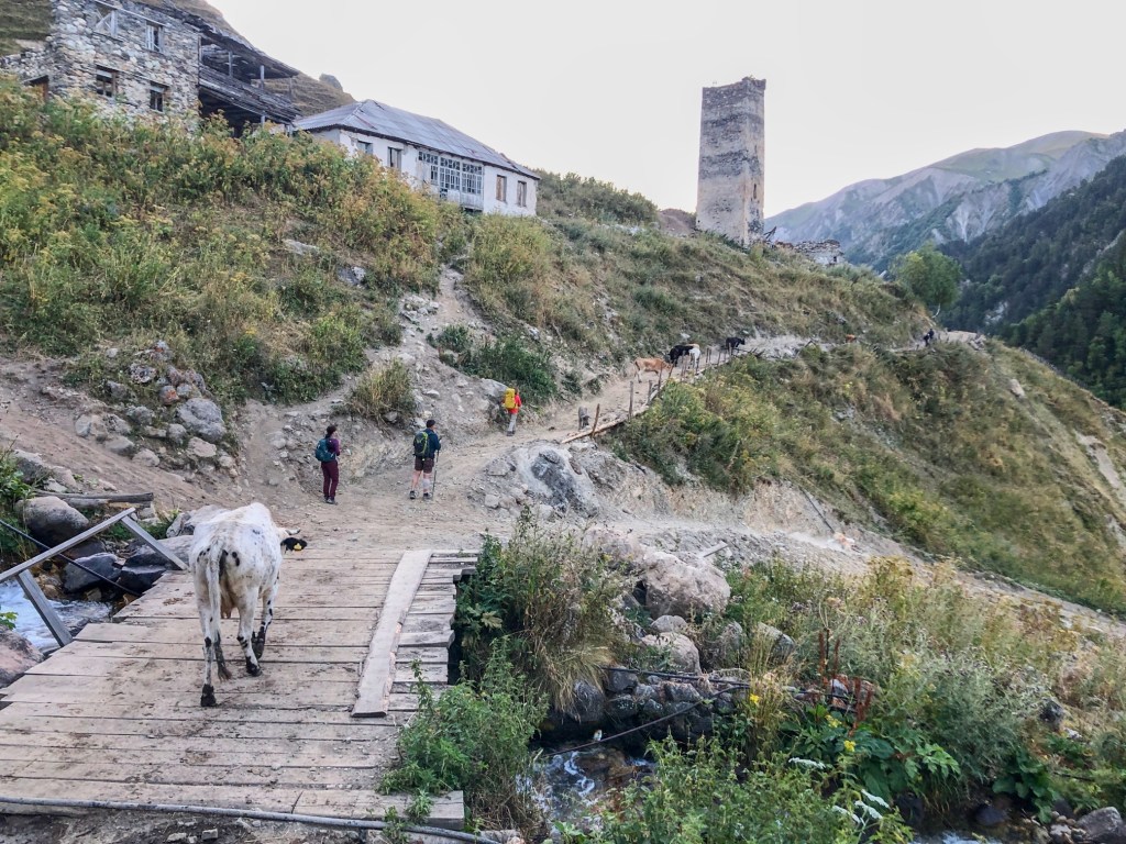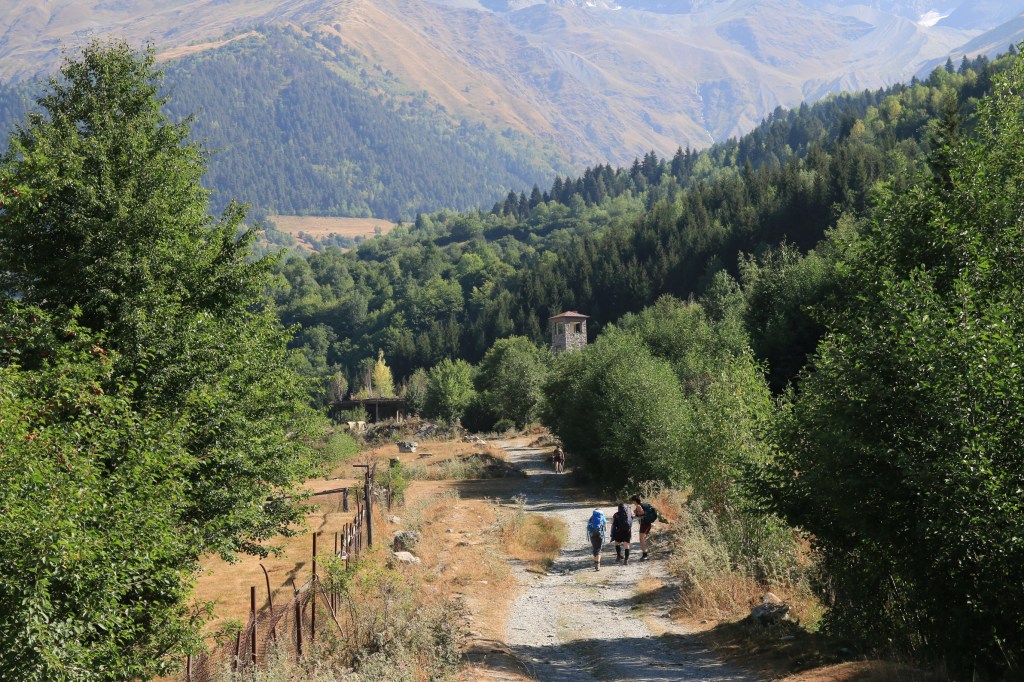 Jdeme na to, pro co jsme zde přijeli – nejkrásnější trek v Gruzii. Kdo četl o Gruzii, musel o něm slyšet – trek Mestia-Adishi-Ushguli. Tří až čtyřdenní trek, dlouhý cca 55 kilometrů, s přechodem tří horských sedel, z nich nejvyšší je ve výšce 2732 metrů, se zdoláváním ledovcové řeky, návštěvou starých Svanetských vesnic. Pomalu stoupáme z Mestie po značené trase nad místní letiště Královny Tamar. Toto letiště je další možnost jak se dostat rychle do Mestie. Cesta autem z Kutaisi zabere cca 5-6 hodin, letadlem tady jste za 45 minut. Nicméně je tady několik ALE. Létá se malým letadlem L410, které je mimochodem české výroby, z Kutaisi a Tbilisi. Lety provozuje společnost Vanilla Sky. Letenka je, díky dotacím vlády, velice levná – z Kutaisi kolem 450 Kč, z Tbilisi kolem 650 Kč. Díky cenám jsou letenky velice dlouho dopředu vyprodané. Druhý problém je, že pokud není v Mestii dobré počasí, tak se nelítá, jelikož se lítá podle VFR (Visual Flight Rules – tzn. vizuálně bez přístrojů). Letiště v Mestii patří podle BBC k jednomu z nejhezčích letišť světa. Bohužel samotné přiblížení a přistání patří mezi nejrizikovější, piloti prudce klesají přes kopce převyšující 2500 metrů do úzkého zatočeného údolí, kde je nutné těsně před přistáním točit prudce doleva těsně nad lesními hřebeny. My pokračujeme dále. Kousek nad letištěm začíná své rohy vystrkovat monumentální hora Ushba – symbol Svanetie. Ushba vás na tomhle treku bude provázet celé tři dny. Dostáváme se na první a zároveň nejnižší sedlo, kde se před námi otevírá dlouhatánské údolí, nad nímž se v pozadí tyčí téměř pětitisícová hora Tetnuldi. Na konci údolí je náš cíl, vesnice Chavbiani. Procházíme údolí, slunce nemilosrdně praží. Prvních pár kilometrů jdeme ještě občas schovaní v borových lesích, ale poslední dvě třetiny už se není kde schovat. Začíná se projevovat únava z horka. Doufáme, že v Lakhiri bude nějaká hospoda, bar nebo obchod, kde bychom si mohli dát něco studeného. Vidíme zkratku, vydáváme se po ní. Po půl kilometru narážíme na ploty všude okolo. Co se dá dělat, přelézáme plot, doufajíc, že nás nikdo nevidí a že nás nesežerou a nerozdupou býci. Máme štěstí a po chvíli a nacházíme silnici a hned u ní malý zapadlý zahradní bar. Dáváme si studené pivo, osvěžujeme se pod studenou vodou ze studny. Pokračujeme a hned opodál potkáváme dva cestovatele, kteří mě oslovili a ptali jestli nevím, proč tady mají ty baráky stavěné takhle do výšky (ukazuje mi na typickou svanetskou stavbu/věž). Vysvětlím jim ve zkratce účel (bude vysvětleno níže) a dáváme se do řeči. Po chvilkové debatě se dozvídám, že jsou z Izraele. Rozloučíme se, aniž bychom tušili, že se ještě potkáme u jedné zajímavé příležitosti. Scházíme na samotné dno údolí, kde protéká ledovcová řeka. Její tok je dost široký a divoký, nicméně jde vidět, že v období tání zimní pokrývky je mnohonásobně větší. Po silnici pomalu docházíme do guesthousu u Iriny. Cestou ještě zažijeme vyřizování účtů mezi dvěma býky přímo uprostřed asfaltové silnice (krávy na silnici, i velmi frekventované, jsou v Gruzii naprosto běžné). Ubytováváme se v guesthousu. Ceny ubytování jsou velmi nízké, zpravidla do 200 Kč. Ovšem na jídle začali místní podnikavci docela slušně rýžovat. Večeře jsou sice velmi bohaté, ale všude dostanete víceméně to stejné – polévku, chačapuri, zeleninový salát, pečivo, a pak se to liší v drobnostech. Cena za večeři se zde pohybuje často kolem 250-350 Kč za osobu, snídaně jsou za cca polovinu. Spoléhají na to, že turisté mají hlad a nenosí si jídlo sebou, obchodů po cestě opravdu moc nenajdete.