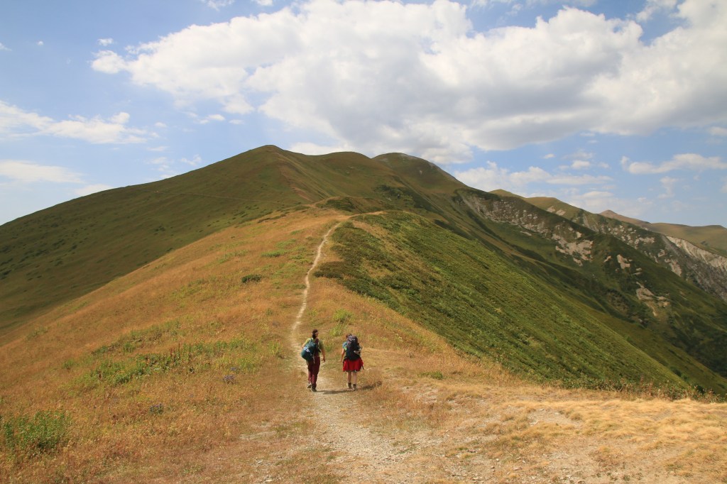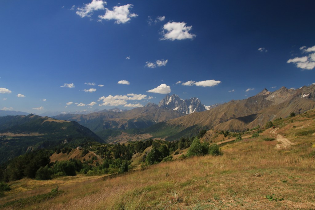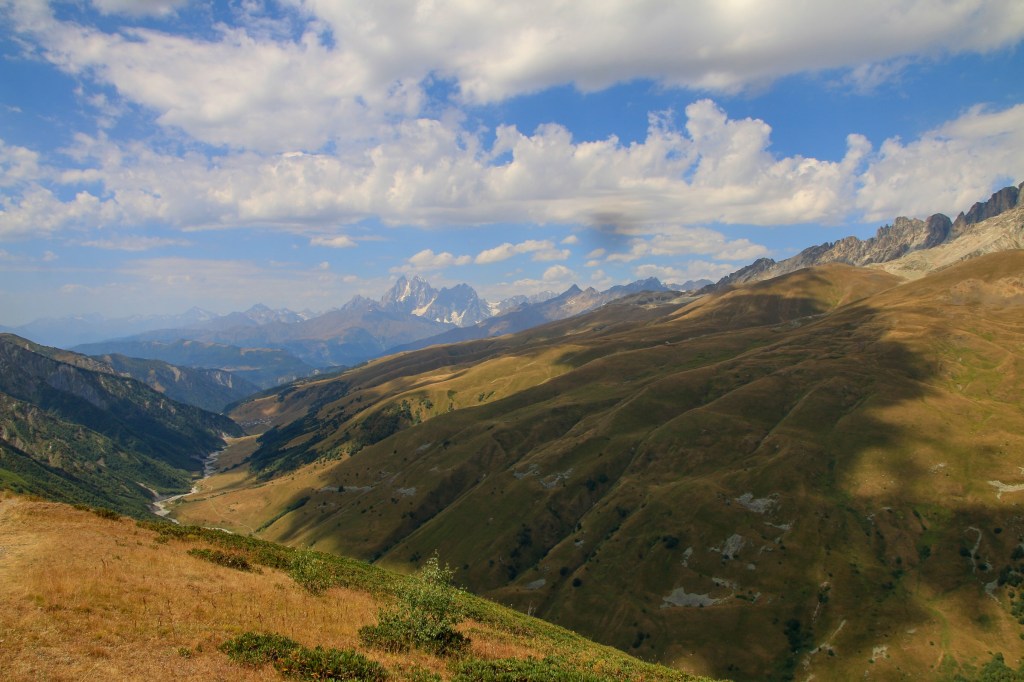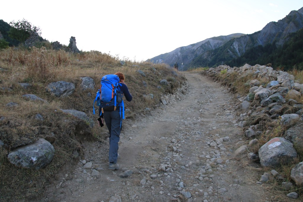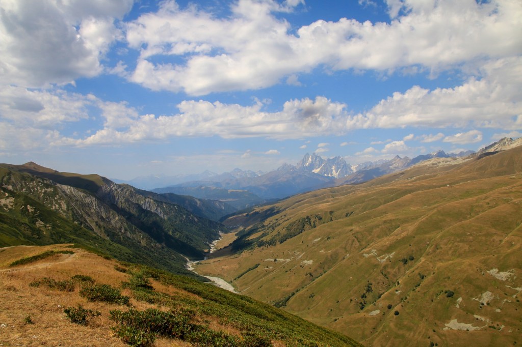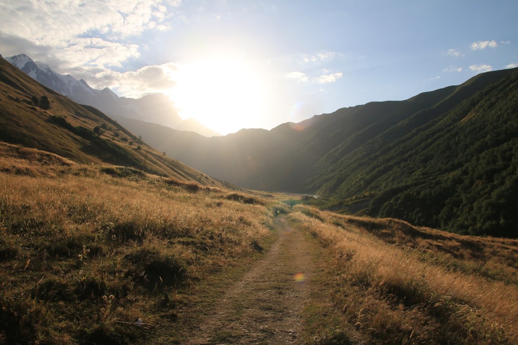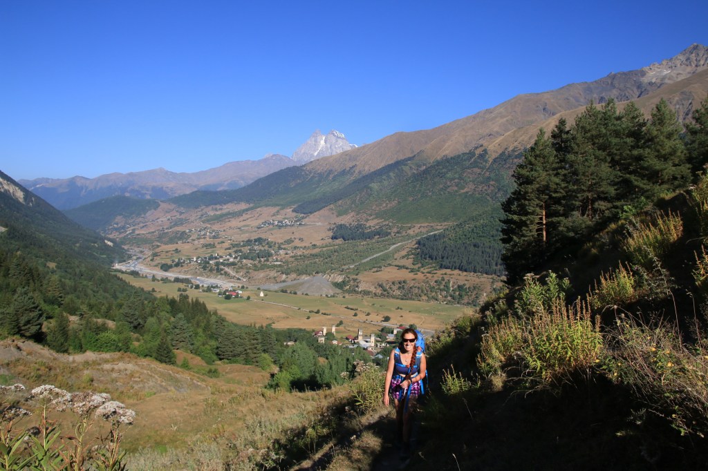 Jdeme na to, pro co jsme zde přijeli – nejkrásnější trek v Gruzii. Kdo četl o Gruzii, musel o něm slyšet – trek Mestia-Adishi-Ushguli. Tří až čtyřdenní trek, dlouhý cca 55 kilometrů, s přechodem tří horských sedel, z nich nejvyšší je ve výšce 2732 metrů, se zdoláváním ledovcové řeky, návštěvou starých Svanetských vesnic. Pomalu stoupáme z Mestie po značené trase nad místní letiště Královny Tamar. Toto letiště je další možnost jak se dostat rychle do Mestie. Cesta autem z Kutaisi zabere cca 5-6 hodin, letadlem tady jste za 45 minut. Nicméně je tady několik ALE. Létá se malým letadlem L410, které je mimochodem české výroby, z Kutaisi a Tbilisi. Lety provozuje společnost Vanilla Sky. Letenka je, díky dotacím vlády, velice levná – z Kutaisi kolem 450 Kč, z Tbilisi kolem 650 Kč. Díky cenám jsou letenky velice dlouho dopředu vyprodané. Druhý problém je, že pokud není v Mestii dobré počasí, tak se nelítá, jelikož se lítá podle VFR (Visual Flight Rules – tzn. vizuálně bez přístrojů). Letiště v Mestii patří podle BBC k jednomu z nejhezčích letišť světa. Bohužel samotné přiblížení a přistání patří mezi nejrizikovější, piloti prudce klesají přes kopce převyšující 2500 metrů do úzkého zatočeného údolí, kde je nutné těsně před přistáním točit prudce doleva těsně nad lesními hřebeny. My pokračujeme dále. Kousek nad letištěm začíná své rohy vystrkovat monumentální hora Ushba – symbol Svanetie. Ushba vás na tomhle treku bude provázet celé tři dny. Dostáváme se na první a zároveň nejnižší sedlo, kde se před námi otevírá dlouhatánské údolí, nad nímž se v pozadí tyčí téměř pětitisícová hora Tetnuldi. Na konci údolí je náš cíl, vesnice Chavbiani. Procházíme údolí, slunce nemilosrdně praží. Prvních pár kilometrů jdeme ještě občas schovaní v borových lesích, ale poslední dvě třetiny už se není kde schovat. Začíná se projevovat únava z horka. Doufáme, že v Lakhiri bude nějaká hospoda, bar nebo obchod, kde bychom si mohli dát něco studeného. Vidíme zkratku, vydáváme se po ní. Po půl kilometru narážíme na ploty všude okolo. Co se dá dělat, přelézáme plot, doufajíc, že nás nikdo nevidí a že nás nesežerou a nerozdupou býci. Máme štěstí a po chvíli a nacházíme silnici a hned u ní malý zapadlý zahradní bar. Dáváme si studené pivo, osvěžujeme se pod studenou vodou ze studny. Pokračujeme a hned opodál potkáváme dva cestovatele, kteří mě oslovili a ptali jestli nevím, proč tady mají ty baráky stavěné takhle do výšky (ukazuje mi na typickou svanetskou stavbu/věž). Vysvětlím jim ve zkratce účel (bude vysvětleno níže) a dáváme se do řeči. Po chvilkové debatě se dozvídám, že jsou z Izraele. Rozloučíme se, aniž bychom tušili, že se ještě potkáme u jedné zajímavé příležitosti. Scházíme na samotné dno údolí, kde protéká ledovcová řeka. Její tok je dost široký a divoký, nicméně jde vidět, že v období tání zimní pokrývky je mnohonásobně větší. Po silnici pomalu docházíme do guesthousu u Iriny. Cestou ještě zažijeme vyřizování účtů mezi dvěma býky přímo uprostřed asfaltové silnice (krávy na silnici, i velmi frekventované, jsou v Gruzii naprosto běžné). Ubytováváme se v guesthousu. Ceny ubytování jsou velmi nízké, zpravidla do 200 Kč. Ovšem na jídle začali místní podnikavci docela slušně rýžovat. Večeře jsou sice velmi bohaté, ale všude dostanete víceméně to stejné – polévku, chačapuri, zeleninový salát, pečivo, a pak se to liší v drobnostech. Cena za večeři se zde pohybuje často kolem 250-350 Kč za osobu, snídaně jsou za cca polovinu. Spoléhají na to, že turisté mají hlad a nenosí si jídlo sebou, obchodů po cestě opravdu moc nenajdete.