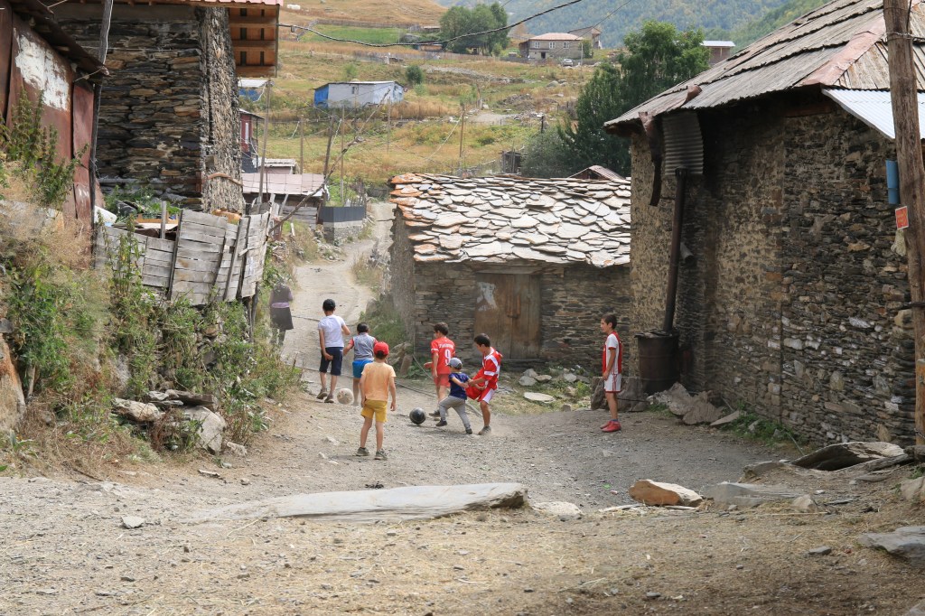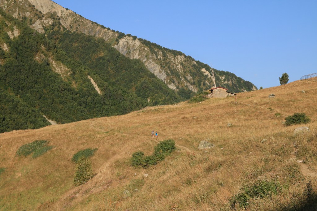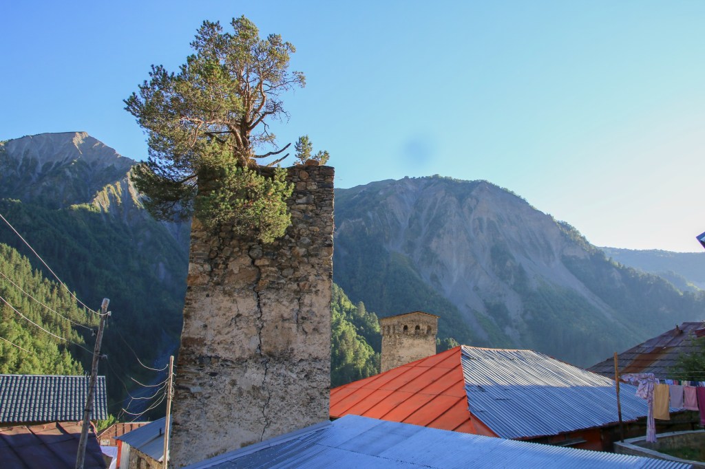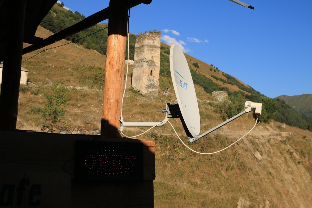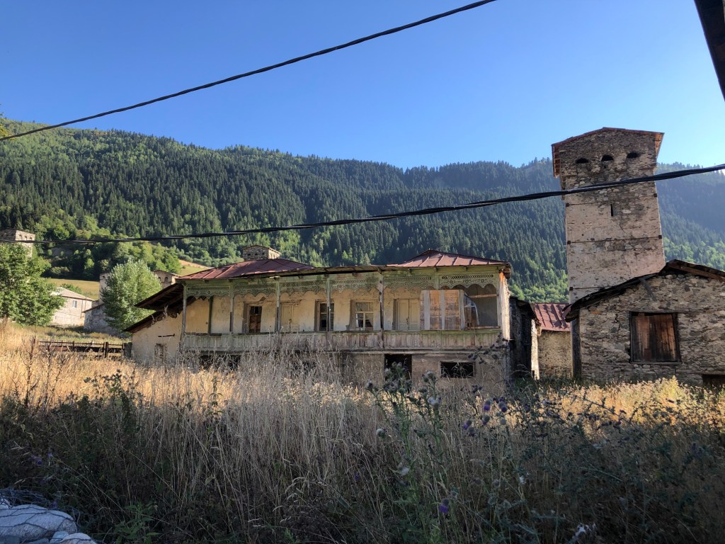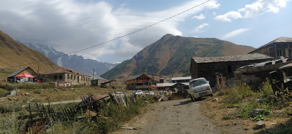 Brzy ráno vycházíme. Hned ze startu nás čeká dlouhé stoupání k místnímu lyžařskému středisku Ski Resort Tetnuldi. Podle mapy vypadá rozsáhle. Čtyři vleky nebo lanovky, z toho tři velmi dlouhé. Ve spodní stanici lanovky je několik hospod pro lyžaře, které z části fungují i přes léto. Akorát nás překvapilo, že jedna byla otevřená, ale vevnitř nebyl nikdo krom dvou dětí ve věku kolem 7 let, které se bavily tak, že shazovaly vysoké komíny kelímků na pivo 🙂 Po 10 minutách čekání se jich ptáme jestli tady mají rodiče, na což nám řeknou že ne. Chvíli čekáme a říkáme jim, že bysme si něco chtěli koupit. Z malých dětí se velice rychle stali hospodští. Prodali nám pivo, colu, dokonce zvládli uvařit kafe. Všechno společně spočítali a dokonce nás i skasírovali. Hleděli jsme 🙂 Pokračujeme dále do Adishi. Za lyžařským střediskem jsme nalezli další malé občerstvení – Tkharpel Hut Cafe, daleko od všeho, ale za to slušně vybavené. Vevnitř seděla postarší babička. Kolem byly postavené lavičky s nádherným výhledem na hory a hlavně zase tu Ushbu, kde jsme se s ní zároveň i rozloučili na delší dobu. O pár kilometrů dále nás na mapě zaujalo kempovací místo. Stará opuštěná a téměř spadnutá bouda, kde na stole bylo nádobí, vevnitř staré kamna – evidentně stará salaš. Hned vedle jsme našli parádní místo na koupání v ledovém potoce. Nedalo se toho nevyužít. Celá naše čtyřčlenná skupina tam nakonec vlezla a bylo to boží. Následující cesta nebyla s výhledy, ale v lese. Nicméně to bylo opravdu krásné a tahle část trasy se mi osobně velice moc líbila. Přicházíme do Adishi. Ač už i tady mají satelity, LTE, počítače, tak samotná vesnice vypadá jak z předminulého století. Pár domů je sice opraveno, ale velká část vesnice je opravdu stará, silnice a uličky mezi domy jsou plné dobytka, bahna nebo prachu a hoven. Ze sloupů s elektřinou jsou domy napojeny tak, že každému českému revizákovi stály vlasy hlavě hrůzou ještě za rok. Stejně tak elektroinstalace v domech je solidní punk a mnohdy i velmi jiskřivé a plamenné povahy. Ubytováváme se guesthousu Nino&Tarzan. Pohodové bydlení s pěkným výhledem na část vesnice a do údolí.