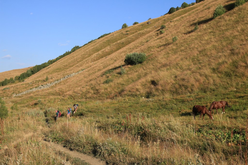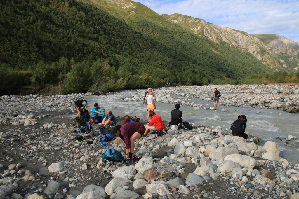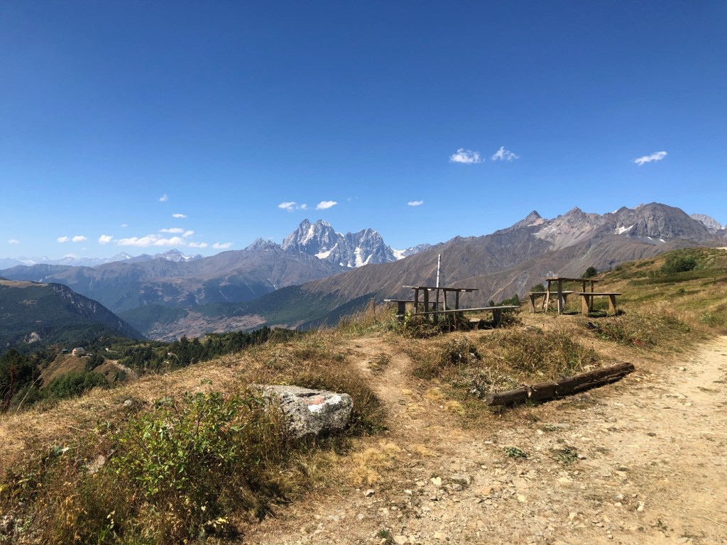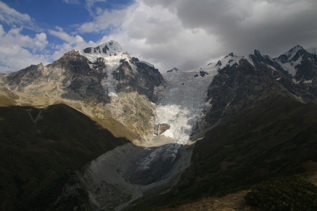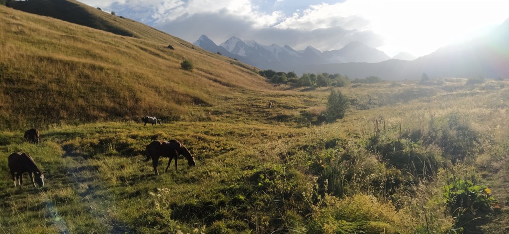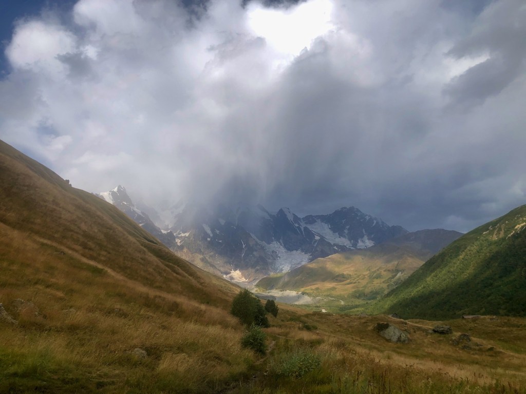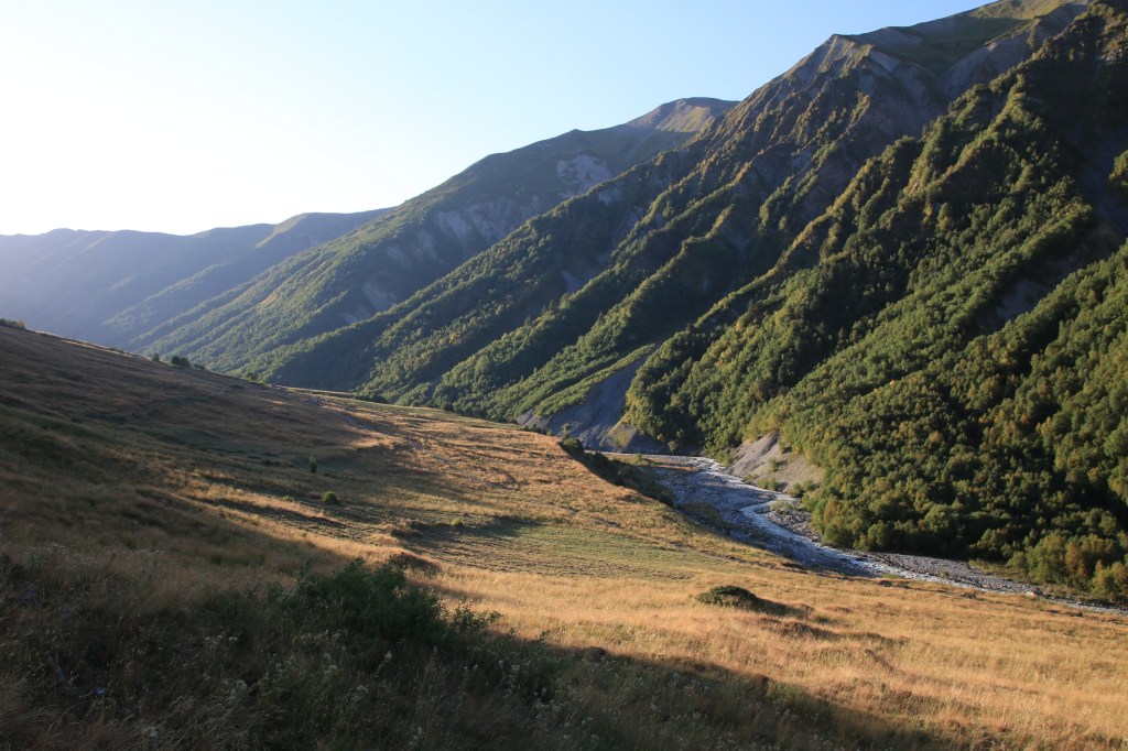 Brzy ráno vycházíme. Hned ze startu nás čeká dlouhé stoupání k místnímu lyžařskému středisku Ski Resort Tetnuldi. Podle mapy vypadá rozsáhle. Čtyři vleky nebo lanovky, z toho tři velmi dlouhé. Ve spodní stanici lanovky je několik hospod pro lyžaře, které z části fungují i přes léto. Akorát nás překvapilo, že jedna byla otevřená, ale vevnitř nebyl nikdo krom dvou dětí ve věku kolem 7 let, které se bavily tak, že shazovaly vysoké komíny kelímků na pivo 🙂 Po 10 minutách čekání se jich ptáme jestli tady mají rodiče, na což nám řeknou že ne. Chvíli čekáme a říkáme jim, že bysme si něco chtěli koupit. Z malých dětí se velice rychle stali hospodští. Prodali nám pivo, colu, dokonce zvládli uvařit kafe. Všechno společně spočítali a dokonce nás i skasírovali. Hleděli jsme 🙂 Pokračujeme dále do Adishi. Za lyžařským střediskem jsme nalezli další malé občerstvení – Tkharpel Hut Cafe, daleko od všeho, ale za to slušně vybavené. Vevnitř seděla postarší babička. Kolem byly postavené lavičky s nádherným výhledem na hory a hlavně zase tu Ushbu, kde jsme se s ní zároveň i rozloučili na delší dobu. O pár kilometrů dále nás na mapě zaujalo kempovací místo. Stará opuštěná a téměř spadnutá bouda, kde na stole bylo nádobí, vevnitř staré kamna – evidentně stará salaš. Hned vedle jsme našli parádní místo na koupání v ledovém potoce. Nedalo se toho nevyužít. Celá naše čtyřčlenná skupina tam nakonec vlezla a bylo to boží. Následující cesta nebyla s výhledy, ale v lese. Nicméně to bylo opravdu krásné a tahle část trasy se mi osobně velice moc líbila. Přicházíme do Adishi. Ač už i tady mají satelity, LTE, počítače, tak samotná vesnice vypadá jak z předminulého století. Pár domů je sice opraveno, ale velká část vesnice je opravdu stará, silnice a uličky mezi domy jsou plné dobytka, bahna nebo prachu a hoven. Ze sloupů s elektřinou jsou domy napojeny tak, že každému českému revizákovi stály vlasy hlavě hrůzou ještě za rok. Stejně tak elektroinstalace v domech je solidní punk a mnohdy i velmi jiskřivé a plamenné povahy. Ubytováváme se guesthousu Nino&Tarzan. Pohodové bydlení s pěkným výhledem na část vesnice a do údolí.