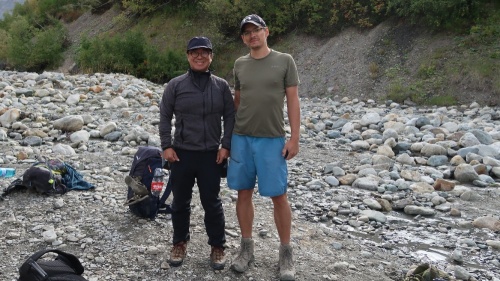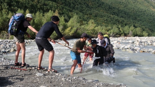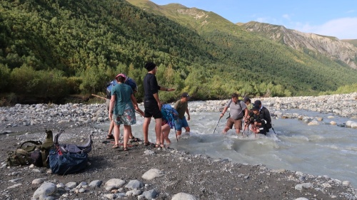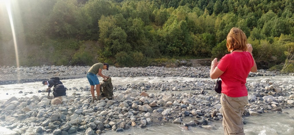 Tento den je velice specifický. Asi pět kilometrů za Adishi je totiž třeba překonávat ledovcovou řeku. A překonávat jakože brodit. Ledovcové řeky jsou specifické v několika věcech. Jejich průtok a výška hladiny se mění v průběhu dne, podle toho jak odtává vlivem slunečního svitu ledovec, ze kterého vytéká. Jedná se o horské řeky, takže jsou často velice divoké a mají silný proud. A nakonec – jsou to ledovcové řeky, které sebou berou sedimenty z podloží ledovce, takže mají specifickou šedou kalnou barvu, tudíž není vidět dno a jejich teplota se pohybuje jen pár stupňů v plusu. Když to shrnu – potřebujeme přebrodit řeku, která je tak studená, že během 10 vteřin necítíte nohy, je plná záludných kamenů na dně, které nevidíte a musíte ji přejít do nejdříve ráno, než se hladina zvedne tak, že vás proud odnese. To vše s krosnou na zádech. Na netu je jen pár fotek jak to vypadá a nevypadalo to nijak hrozně. Ale o tom později. Vycházíme z Adishi, s námi ve stejné době jde asi dalších 5 lidí a pár potulných psů, mezi kterými se během chvíle strhne bitka jak z Mortal Combatu. K samotnému brodu to máme cca 5 kilometrů, což znamená zhruba hodinu cesty. Vycházíme opravdu časně ráno, kdy je slunce ještě schované za kopci. Je chladno, představa, že budu muset lézt do řeky, jejíž teplota připomíná vychlazeného Jagermeistera mi moc dobře nedělá. Ale s vycházejícím sluncem jde nahoru i teplota, což je sice fajn, ale k výše popsanému to ideální není. Jenže to, co slunce na místních kopcích a nekonečných travnatých loukách předvádí, je neuvěřitelně krásně. Tahle část cesty mě z celého treku uhranula nejvíce a mám ji stále před očima. Ranní zlatá hodinka byla neuvěřitelně krásná. To vše kousek dále ještě tuplovali pasoucí se divocí koně. Slovy to nejde popsat, něco málo řekne fotka. Ale tu atmosféru prostě člověk pochopí, až když ji zažije přímo na místě. Údolí ale končí a teď přichází ta nejadrenalinovější část trasy. Došli jsme k brodu. Síla a rychlý proud řeky mě trochu znejistěly. Rada našeho kamaráda Sharpa zněla hledat co nejširší místo, kde se proud více rozprostře a ideálně si vytipovat velké kameny, za které se dá před proudem schovat. Jenže tady nic takového nebylo. Řečiště bylo široké od 4 do 8 metrů, ale proud byl všude stejný. Nakonec jsme vybrali místo, kde je brod zaznačený i v mapě, s šířkou cca 6 metrů. Okolo toho místa už nějakou dobu zmateně a nešťastně pobíhali oni zmínění Izraelci a starší korejský pár. Kvůli těmhle 6 metrům sebou taháme na přezutí sandále. Ovšem to nebyl fakt vůbec blbý nápad. Balím foťák do vodotěsného obalu, beru turistické hole a jdu do toho. První plán byl, že uděláme lidský řetěz a přetáhneme se, to se ale jeví jako pitomost. Je třeba se v té vodě pořádně uzemnit aspoň na třech místech, stejně jako při lezení na skálu. Jsem v polovině řeky, ostatní mě sledují. Voda mi sahá do poloviny stehen. V tuhle chvíli už asi 10 vteřin necítím svoje nohy od kotníků dolů. Ale přešel jsem. Mezitím začíná přecházet zbytek výpravy. Otočím se a vidím Peťu, což je statný vysoký chlap, kterému by tahle řeka neměla dělat problém a na něj navěšenou celou ženskou část expedice. Do toho asi metr proti proudu začínají přecházet dva Korejci a dva metry po proudu začínají přecházet Izraelci. Korejka se vrhla do vln jako první a šlo vidět, že ji to překvapilo a měla v očích hrůzu. Navíc místo, kde přecházeli bylo hlubší a ona vážila i s tou krosnou sotva 40 kg. Při pohledu na ni, mi blesklo hlavou, že když ji vezme proud, tak podrazí nohy Péťovi, na němž visely další 3 holky a ti všichni potom sebou vezmou i ty Izraelce. Takže ještě s krosnou letím do vody a pomáhám Izraelcům, kteří jsou již téměř na břehu. Potom shazuju krosnu a pomáhám Janě, Zuzce, Zdeňce, po nichž následuje korejka i její manžel. Péťa s Renčou zvládají dojít na břeh sami. Všechno se to odehrálo strašně rychle, vůbec nevím jak dlouho to trvalo, ale mám totálně necitlivé nohy od kolen dolů. Jak začínají rozmrzat, začínají bolet, pálet, brnět. Po nasazení ponožek to ale naštěstí rychle ustává. Do toho za mnou přibíhají korejci a strašně mi děkujou. Potěšilo, neříkám že ne, ale jediné co jsem chtěl bylo, aby se nikdo v té vodě nevyválel, což se nakonec povedlo. Po usušení a zahřátí dáváme pauzu a snídáme. Krom zdolávání řeky nás čeká ještě výstup na nejvyšší sedlo treku – Čchunderi pass s výškou 2732 m. Stoupání je dlouhé, ale nijak extra náročné. Během stoupání se nám za zády otevírá pohled na ledovec Adishi, z nějž vytéká námi zdolaná řeka. Čas od času z něj ozve zlověstné zapraskání ledu a občas se někde objeví místo z nějž se vysype hromada drceného ledu. Po výstupu do sedla se otevírá pohled do údolí, které jsme ráno procházeli, na jehož konci je vidět vesničku Adishi a nad ní se opět vzpíná mocná Ushba. Asi 300 metrů od nás a dalších cca 100 výškových metrů je panoramatický výhled na všechny strany. Sice je to jednosměrná cesta do kopce, ale ten výhled stojí za to. Holky Renča a Zdeňka jdou na opačnou stranu, protože chcou zdolat nějakou třítisícovku. Později se dozvídáme, že nahoře našly nějaké vodovodní armatury. Netušíme k čemu to mohlo sloužit, jestli to bylo jen na čerpání vody nebo tam byl nějaký tajný vojenský komplex. Ze sedla jdeme nekonečným klesáním do údolí řeky Khaldeshala a míříme do vesnice Khalde. Trasa se nachází na málo užívané polní cestě, pod níž je většinou asi padesátimetrový útes, který končí přímo v ledo