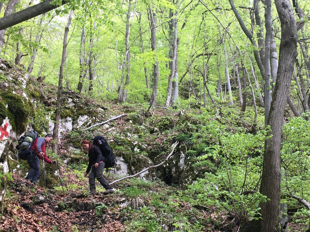Po snídani v hotelu jsme se nacpali do dvou taxíků Dacia Logan s krosnama (4 lidi + řidič). V Coltesti vyskakujeme z taxi, hbitě platíme a chystáme krosny. V tom si říkám – kde mám k sakru foťák?? Do prdele…. Zůstal za opěrkou hlavy na zadním okně. Volám řidiči, který před 2 minutami odjel. Říkal, že se vrátí. Pevně v to věřím, protože ztracená zrcadlovka a objektivy by zabolely. 5 minut pryč a řidič nikde. Začínám se smiřovat s tím, že mě rumunský taxikář obere o zrcadlovku. Za další dvě minuty slyším, jak se mezi domky line typický zuřivý zvuk Dacie Logan. Přijel!!! Jako dík mu dávám nějaké místní valuty. Mizíme do hor. Hned v zápětí za vesnicí ztrácíme modrou značku. Rozhodnutí, nejbližší kolmicí jít k ní a napojit se, se nějak nepovedlo. Dostali jsme se úplně mimo a bez GPS bysme byli v háji. Po dvou hodinách prodírání se po zvířecích stezkách, objevujeme ceduli přírodní rezervace s fotkama zdejších zvířat. Nechybí vlci, medvědi, rys 🙂 Docela fajn místo na to, prolézat zvířecí stezky zarostlé křovinama. Po další cca hodině nacházíme ztracenou modrou stezku a blížíme se na náhorní plošinu Bedeleu. Zde se máme dát po červené stezce, kterou nám okupují doslova stovky býků, nemáme odvahu to mezi nimi projít a proto nám připravili obchůzku cca 1.5 km navíc. Z pastvin mizíme zase do lesů, k jeskyni Pestera de la Grosi. Nenápadný vchod do jeskyně, kterým musíte projít téměř po čtyřech, vám ukáže asi 50 metrů dlouhý sál plný krápníků a netopýrů. Hned vedle jeskyně je obrovský skalní portál vysoký asi 7 metrů. Po dalších 10 minutách chůze přicházíme na vyhlídkový balkón postavený přímo na skále ve výšce asi 400 metrů nad údolím. Tento den máme klesat dolů k jeskyni Huda lui Papara. Ale naskytuje se problém. Sestup s těžkými krosnami je natolik brutální, že musíme nocovat pod skalami. Sestup z vyhlídky dolů po značené stezce je s převýšením cca 400 metrů na 1 kilometru trasy. Těžká krosna tlačí z kopce, podklad jsou mokré kameny a kořeny. Nevyhýbají se nám pády, které ale naštěstí končí jen modřinami. Cestou k tábořišti část výpravy málem zasáhne velký kámen, který se utrhnul ze skály asi 200 metrů nad námi. Naštěstí to dobře dopadlo. Tábořiště je v blízkosti vodopádu Sipote. Už za šera rozděláváme stany. Později zjistíme, že máme stan vchodem otočený asi 3 metry od hrany skály vysoké přes 20 metrů. Takže večer chodit čůrat musíme fakt opatrně.
