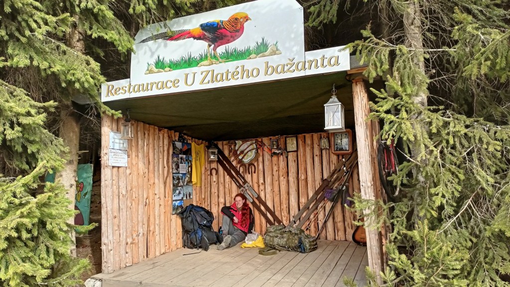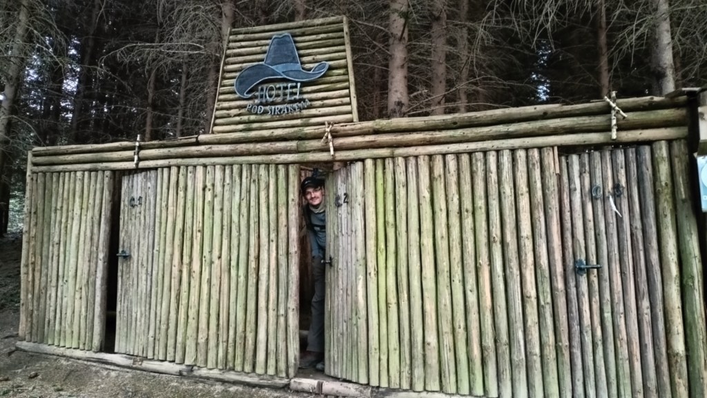 Druhý den jsme si dali mohutně velkou a dobrou snídani a vyrazili na nejdelší úsek z Vršatce na lesní ubytování nad Střelnou – zhruba 20 kiláčků. Už předchozí den jsme tady procházeli, ale zastavili jsme se znova u Brezové kaplnky. Perfektní místo pro Stezkaře. Je tam silný a snad i stabilní pramen vody, je tam obrovský přístřešek na přespání, byť střecha úplně dešti odolná nebude a chybí i boční stěny, nicméně zde najde útočiště na noc, dle mého, i 30 lidí. Od tohoto místa pokračujeme po červené k hranici na rozcestí Pod Okršliskem. Odsud je to taková příjemná hřebenovka, chvíli rovně, chvíli trochu dolů, chvíli trochu do kopce. Půda utíká pod nohama, míjíme pomník Pátera Marka Martišky a scházíme na rozcestí Nad Nedašovou Lhotou. Odsud následuje stoupání na Láz. Za námi se okrývají výhledy, zase úplně jiné než jsme měli dosud. V dáli vidíme i skalnatý kopec, který tyčil nad Vršatcem. Vše se objevuje jen v náznacích, které propustil saharský prach. Následující kus trasy by byl docela hezký, kdyby nebyla lesní cesta rozježděná od traktorů a kdyby kolem nás pořád nelítal nějaký kretén na terénní motorce. Motorku v lese slyšíme pořád. Pěkné tábořiště míjíme na rozcestí Požár. Míjíme malou, ale moc hezkou chatovou osadu, plnou krásných dřevěnic. Přeskakujeme silnici a míříme na nejvyšší vrchol celé výpravy – Končitá s 817 metry. Nevím proč, ale název mi pokaždé, kdy jsme o něj zavadili v mapě nebo rozhovoru, připomínal Conchitu Wurst (kdo neví, nechť si vygooglí 🙂 ). Z Končité už nás čekala cesta víceméně pořád jen dolů do Střelné. Už na vrcholu Končité jsou všude cedule upozorňující na velkou střelnici v oblasti. Cedule jsou zde na každém kroku. Aby ne, jedná se střelnici bývalé zbrojovky Vsetín, která se specializovala na výrobu velkorážných zbraní pro armádu a policii. Mezi její výrobky patří třeba letecký dvojkanón Plamen PL-20, montovaný na bitevníky L-159 Alca. Takže nelézt za značky, ať vás vystřelí do vesmíru! Přicházíme do Střelné. Víme o místní hospodě U tří soudků. Zuzka mluví o tom, že si dá aspoň polívku nebo možná i něco více. Před hospodou nám mírně začínají cukat koutky. Z nápisu poodpadávaly nějaké písmena a tak na zdi stojí “ tří oud ů”. Smát jsme se začali vevnitř, když po otevření dveří místní typické “čtyrky”, na vás padne 6 očí. Uprostřed hospody u jednoho stolu seděli ti “tři oudi” a pili pivo 😃 Po letmém pohledu směrem k baru nám bylo jasné, že tady polívka fakt na pořadu dne nebude. Objednali jsme si tedy pivo, Radegast na čepu byl pouze 10ka, ale tak nevadí. Potěšila cena 35 kč/ks – to už se u nás moc nevidí (resp. asi spíše vůbec – jestli máte někdo u vás Radegast za 35 kč napište do komentáře dolů nebo na FB 🙂 ) K tomu jsme si na zahnání hladu objednali chipsy a křupky. Celková útrata byla taky parádní – za 5 piv a dvě balení pochutin jsme zaplatili 215 kč 🙂 Už unavení a lehce opivněni jsme se museli dostat k lesnímu ubytování nad vesnicí. Bylo to do kopce. Cestou jsme narazili na oficiální milník Stezky Českem – 100 km na nejvýchodnější bod, 900 km na nejzápadnější bod 🙂 V polovině kopce u nás zastavuje terénní auto, ve kterém sedí místní starší manželský pár, který se nás ptá kam jdeme spát. Tak říkáme, že do přístřešku nad vesnici. Řekli nám, že tam je prázdno ( dříve jsme měli obavy, aby jsme se vešli, prý tam bývá plno) a ještě nám řekli, že místní turisti dělají u posezení v lese, na začátku křížové cesty oheň, že tam mají pivo a víno. Na cestu jsme dostali ještě každý panáka domácí slivovice. Na místě, kde jsme chtěli spát opravdu nikdo nebyl. Celé místo postavil nějaký místní, který je údajně trochu poblázněný a běhá tam potom ráno a po turistech, kteří tam přespí vybírá po 100 kč. Ale na druhou stranu. Na místě je vyhloubená studna, odkud teče voda. Je tam přístřešek s rovnou podlahou, kde se vyspí cca 6 lidí. Je tam ohniště s naštípaným dřívím, je tam udírna (nevím kolik turistů cestou udí 🙂 ). Hlouběji v lese je “hotel pod širákem”. Z dřevěné kulatiny udělané 3 zavíratelné pokoje, bez střechy. Spí se na lesním podloží, ale v noci vás nebudou otravovat potulní psi, vlci, medvědi, lišky atd. Ještě dále v lese je kadibouda. A dominanta je velká zastřešená zvonice s funkčním zvonem a velkým stolem pro 10-12 lidí. Takže dá se říct, že naprosto full turistický servis. Pokud tu přespím, tak mu klidně tu stovku za noc dám. Rychle jsme rozdělali spaní v Hotelu pod širákem, sebrali klobásky, které jsme sebou táhli a letěli do lesa na místo pořádání párty, abysme se najedli. On celý ten turistický “resort” byl na kopci, na návětrné straně a pořád brutálně foukal ten vítr, takže rozdělávat tam oheň byl bylo fakt o obrovský průser. Cestou do lesa potkáváme notně připité místní holky, které už šly domů, ale říkaly, že oheň hoří. Slyšíme hlasy blížíme se k místu a v tu chvíli se ozve “ssssssssssssssssssssssssssssssssssssssssssssss”. Borci právě uhasili oheň, dívajíc se na nás jak držíme dvě syrové klobásy v ruce a říkají “tož teď sme to poléli” a rychle nám podávají pár kartonů, že to ještě rozhoříme 🙂 No ani smykem. Zapalovač byl prázdný a ohniště úplně mokré. Aby nemuseli táhnou ty staré 20 litrové várnice ještě se zbytkem svařáku zpátky, tak nám nalijou 2 kelímky a mizí ve tmě. Tak jsme si dali studené klobásky, zapili to svařákem a šli jsme do našeho hotelu. Usnuli jsme v pohodě. Asi v jednu v noci přiběhli nějací Stezkobě