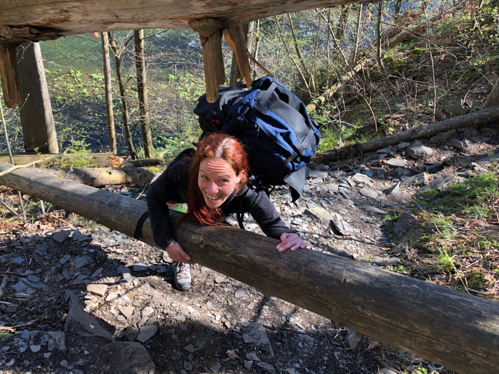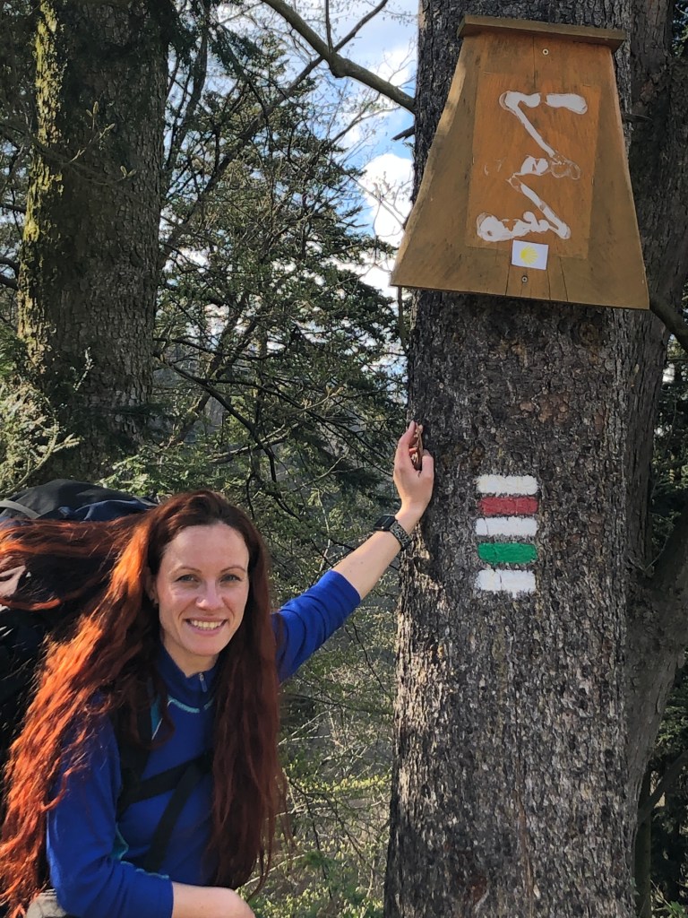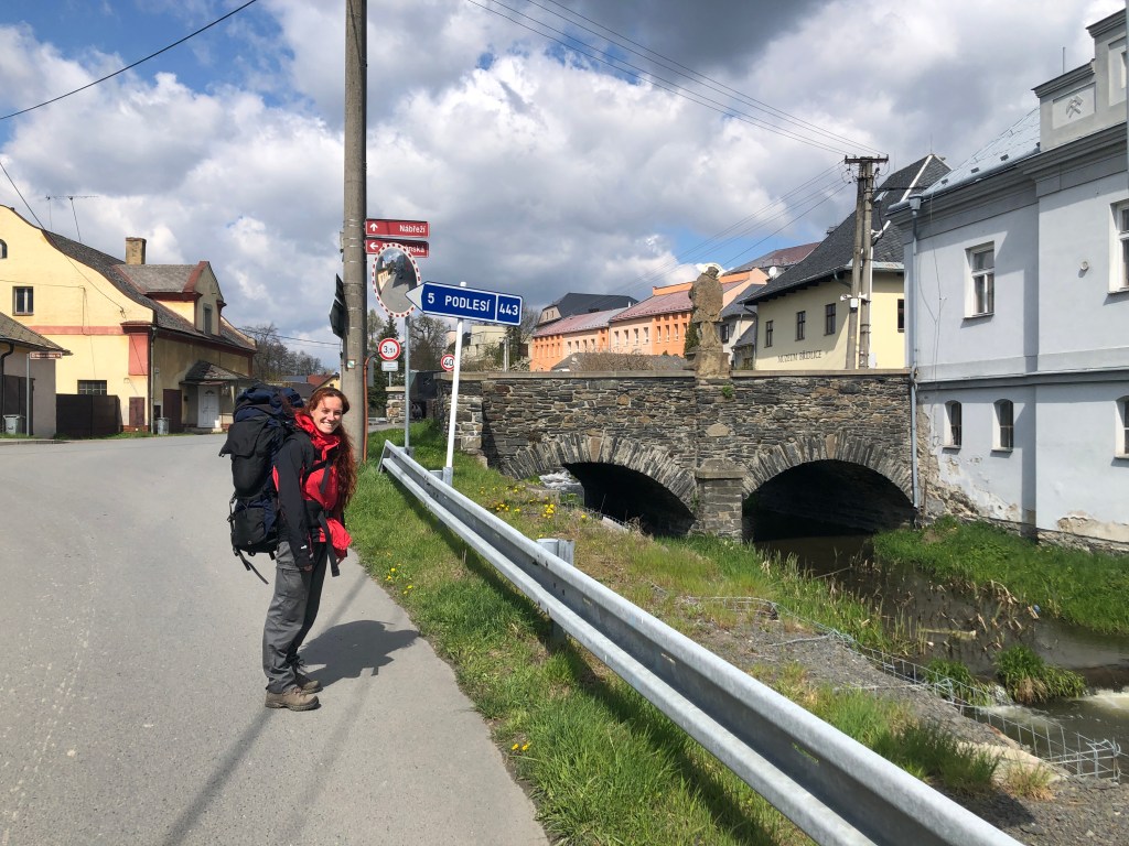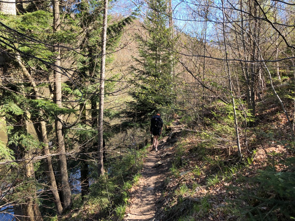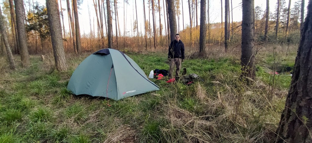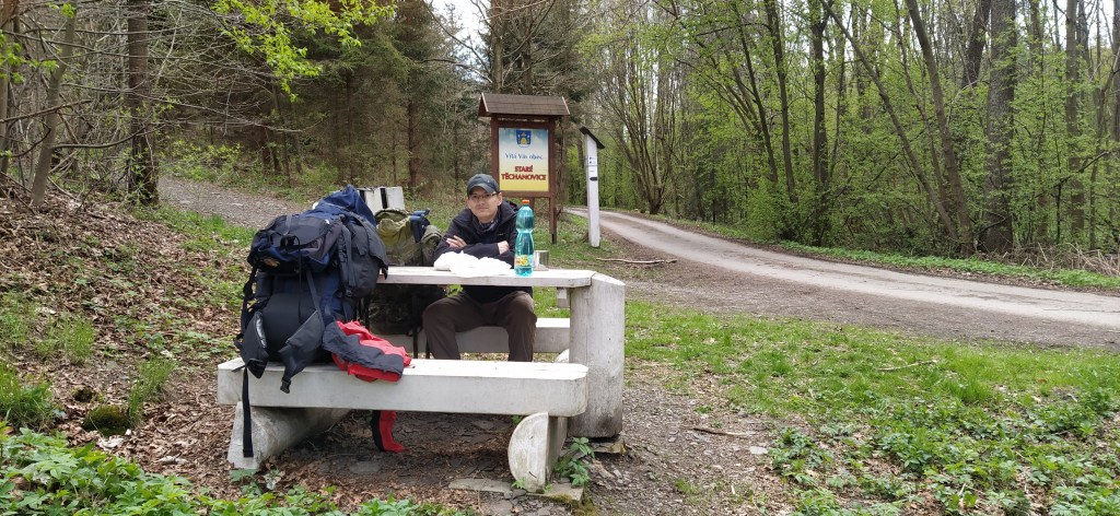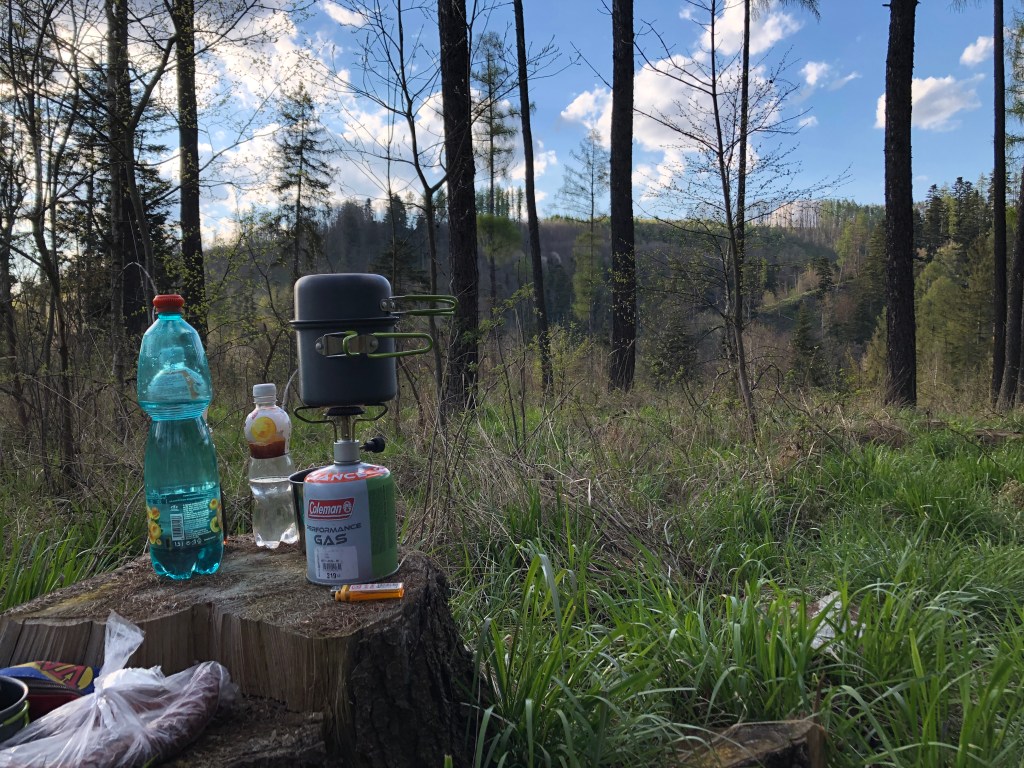 Zde mě poprvé překvapilo, že od řeky stoupáme vzhůru do lesů. A pak zase prudce klesáme. A pak zase stoupáme 🙂 Zde vede červená stezka ke kapli 14 pomocníků, ale uhýbáme po zelené, čím si krátíme vzdálenost i výškové metry. Stezka je zde opravdu úzká a nakloněná, s těžkou krosnou to nebyla příjmená chůze. Ale zato objevujeme vyhlídku na skále. Krásný placatý vršek s rozhledem do údolí – pecka. Míjíme vodopády v Zálužném a za hlavní silnicí odbočujeme z červené stezky k pramenu pro vodu. Tady narážíme poprvé na kolegu, který stejnou trasu prochází sám. Prohodíme pár slov, nabereme vodu, která byla mimochodem velmi chutná a skrz chatoviště míříme k vyhlídnutému místu na táboření. Kousek od něj je malá hájovna, která asi slouží jako restaurace – v dobách před koronou. Vypadá opuštěně a strašidelně. Místo, kde jsme chtěli přespat bylo totálně zarostlé náletovými dřevinami, místní neudržované lesy neposkytnou kousek rovného místa. Nakonec se nám podařilo místo najít. Hned vedle jsme měli z pařezů a starých popraskaných kmenů stůl i s lavicí k sezení 🙂 Poměrně brzy uleháme. Nádherné lesní ticho a zpěv ptáků doprovází jen vzdálené bručení transformátoru 😀