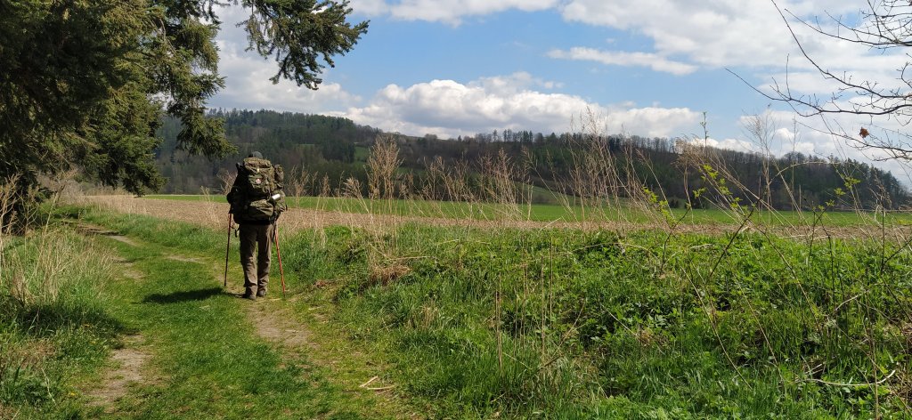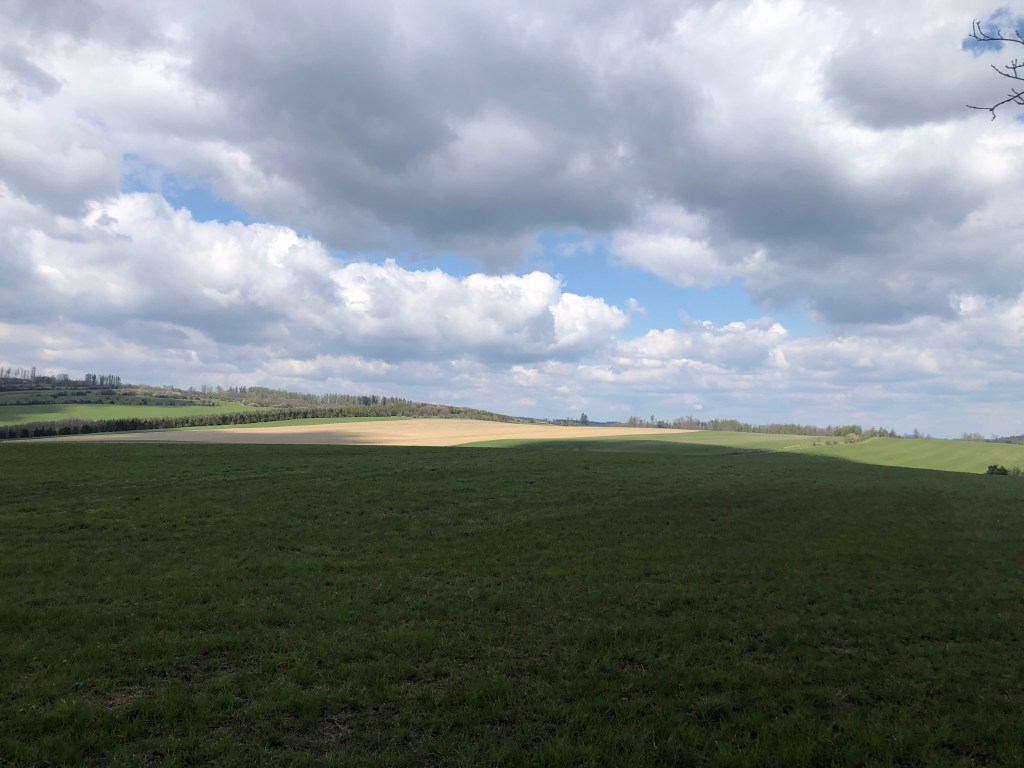 Podle map cca 39,8 km, což je na dva dny slušná porce, zvlášť s krosnou na zádech. Začínáme tedy v Budišově. Procházíme městem a vydáváme se přes kopec směrem k vodní nádrži Kružberk. Cesta zde vede po asfaltu, nic extra záživného. Přecházíme vrchol kopce, kde se nám naskytne pěkný výhled na pastviny, kde se honí stíny mraků. Chvíli mi to připomíná louku z plochy ve Windows XP 🙂 Počasí si s námi hraje. Na slunku na triko, ale jakmile zaleze a začne foukat, tak to je na mikinu a bundu. Scházíme níže a přes lesy už je vidět hladina Kružberku.