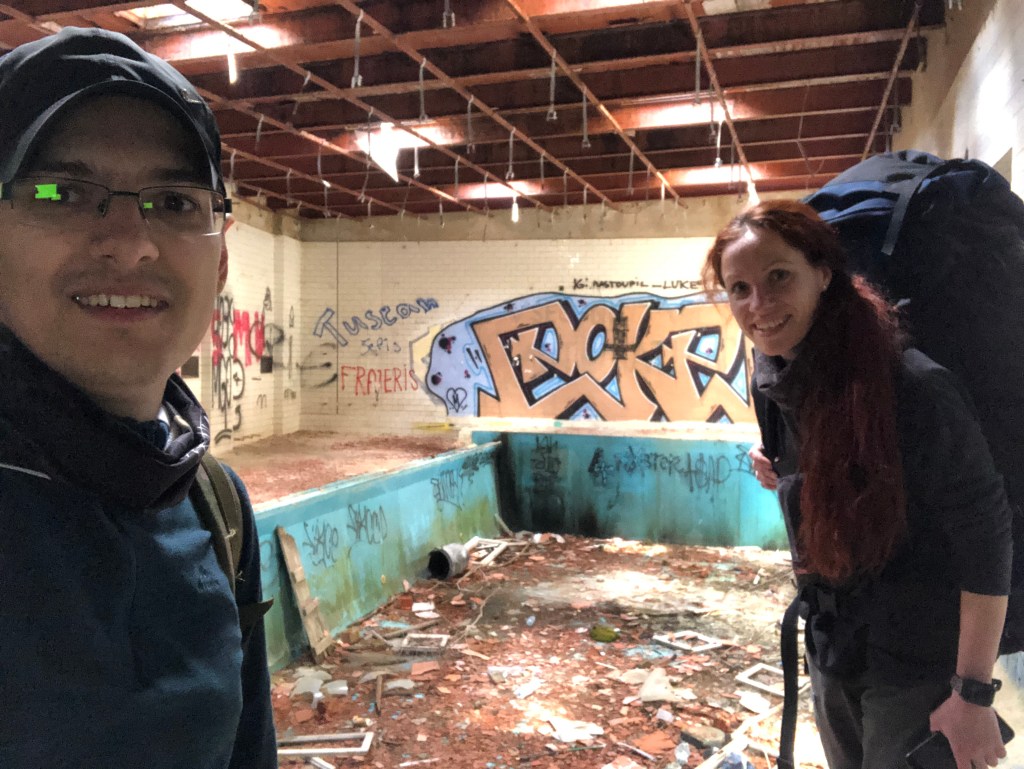 Za vesnicí Kružberk odbočujeme na starou asfaltku směrem k Jánským Koupelím. Jánské Koupele jsou kapitola sama pro sebe – těm jsme se věnovali loni na jaře. Velký fotoreport zde. Kdysi nádherné malé lázně v naprosto kouzelném údolí Moravice, dneska zničené a posprejované ruiny. Procházíme se mezi zničenými budovami, které lákají spousty turistů. Podařilo se nám dostat do společenského sálu, kde předtím nebyl přístup. Zde nás zaujalo, že na některých oknech byly ještě záclony a hlavně úžasně zachovalý vyřezávaný dřevěný strop. Jánské koupele necháváme za sebou a pokračujeme dále v putování tímto jedinečným údolím.